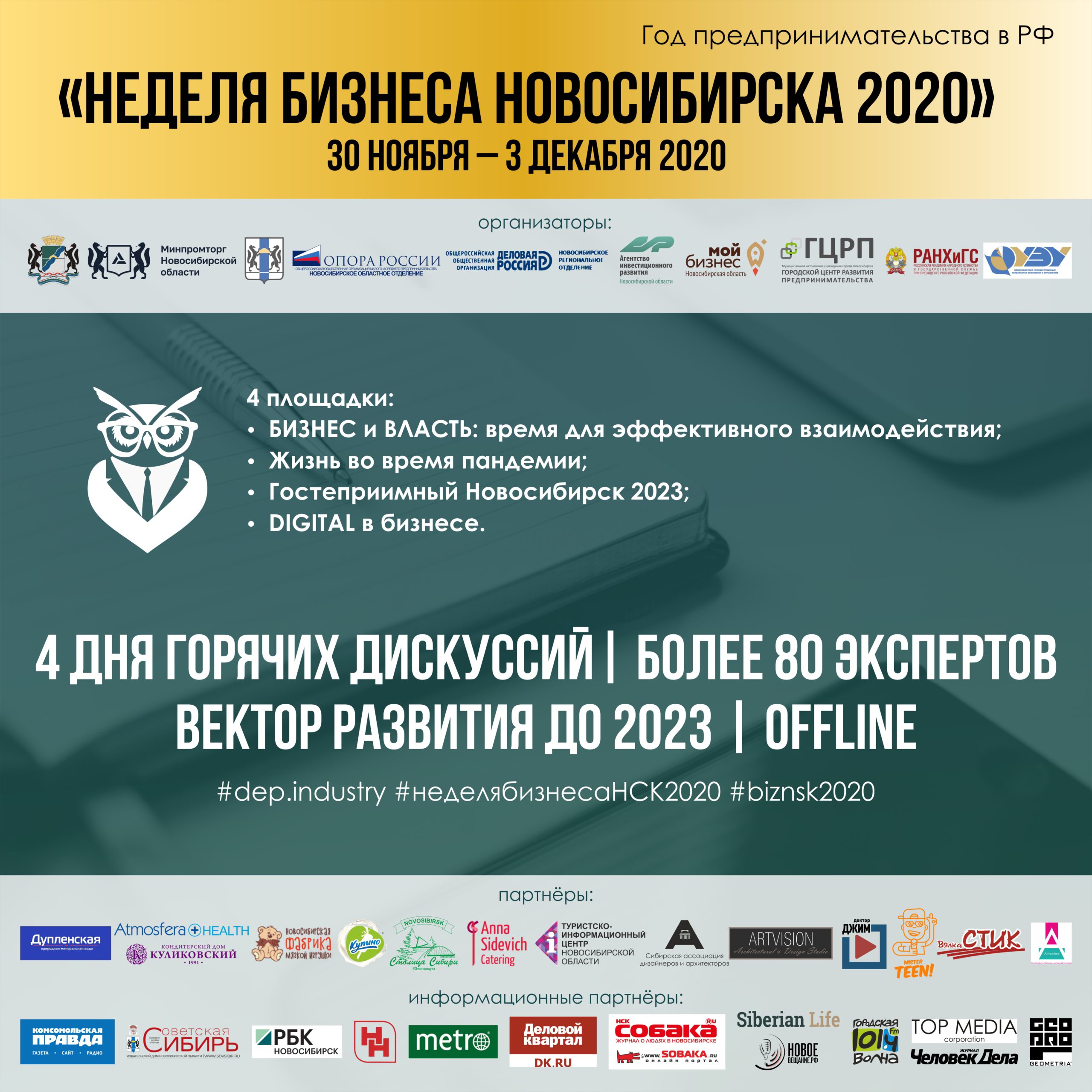 Партнеры мероприятия: министерство промышленности, торговли и развития предпринимательства Новосибирской области, министерство экономического развития Новосибирской области, «ОПОРА РОССИИ», Агентство инвестиционного развития Новосибирской области, центр «Мой бизнес», бизнес-инкубатор «Точка кипения» НГУЭУ, МАУ «Городской центр развития предпринимательства», компания по производству антисептиков и других средств индивидуальной защиты «AtmosferaHealth», минеральная вода для всей семьи «Дупленская», КД «Куликовский», ООО «Купинское мороженое», ООО Экофабрика «Столица Сибири», фабрика мягкой игрушки «Новосибирская», Ассоциация «САДА»,видеостудия «Доктор ДЖИМ», «Mr. Teen».