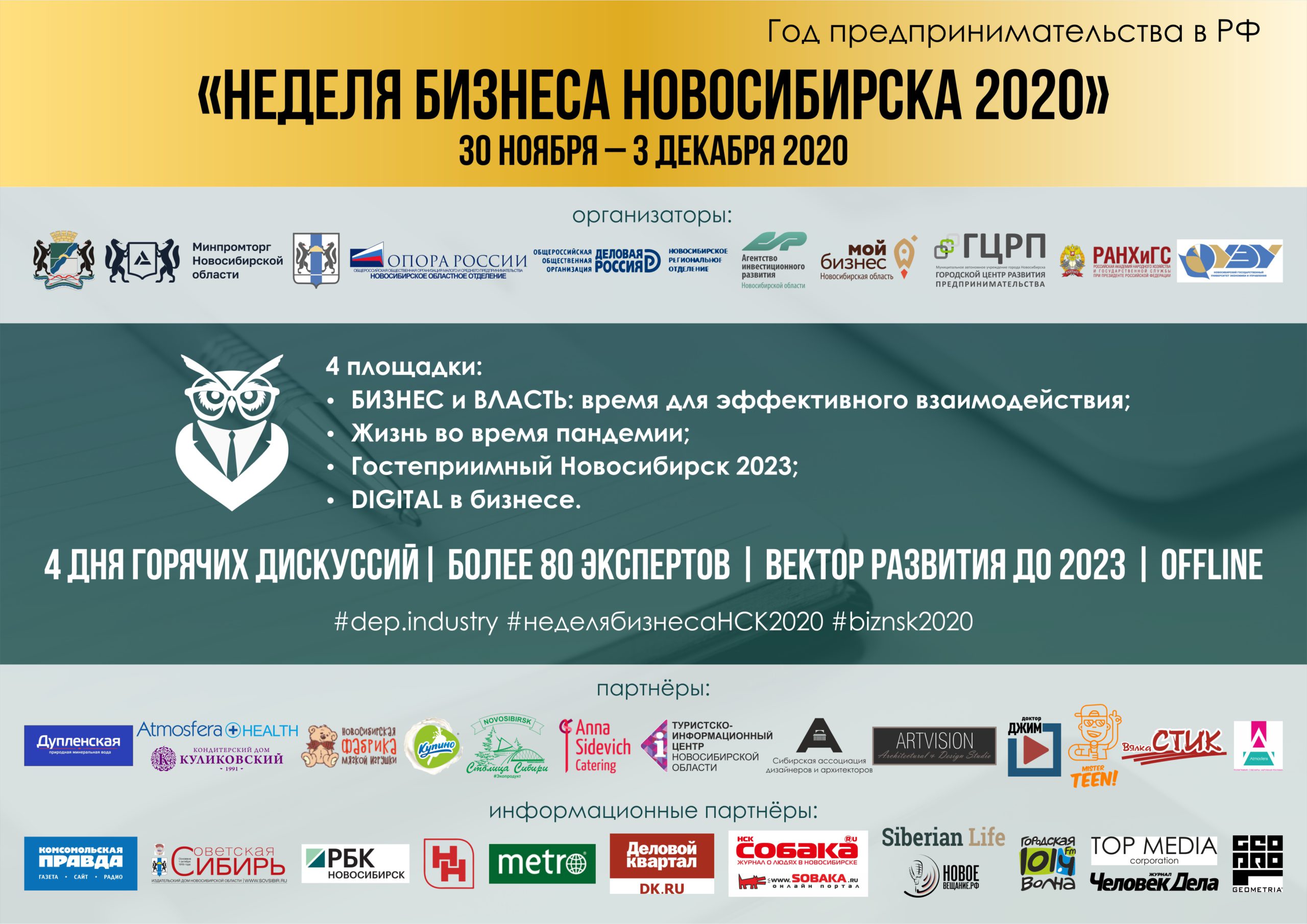 Партнеры мероприятия: министерство промышленности, торговли и развития предпринимательства Новосибирской области, министерство экономического развития Новосибирской области, «ОПОРА РОССИИ», Агентство инвестиционного развития Новосибирской области, центр «Мой бизнес», бизнес-инкубатор «Точка кипения» НГУЭУ, МАУ «Городской центр развития предпринимательства», компания по производству антисептиков и других средств индивидуальной защиты «AtmosferaHealth», минеральная вода для всей семьи «Дупленская», КД «Куликовский», ООО «Купинское мороженое», ООО Экофабрика «Столица Сибири», фабрика мягкой игрушки «Новосибирская», Ассоциация «САДА»,видеостудия «Доктор ДЖИМ», «Mr. Teen».